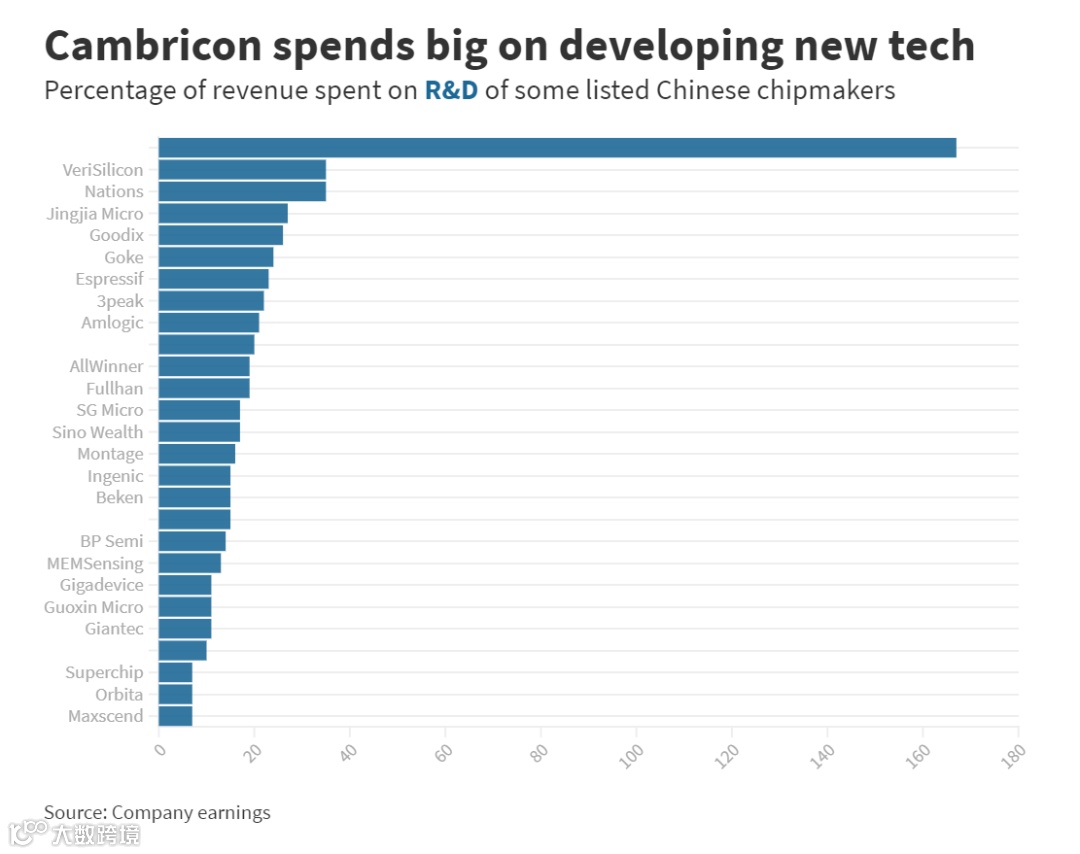 看看在上海和深圳上市的中国无晶圆厂公司,我们可以看到 2020 年的平均研发投入占收入的 23% 左右。除去一个明显的异常值,寒武纪,它在研发上花费了 167% 的收入(这是在烧钱到-catch-up 阶段,在某些方面应该算作初创公司),这个百分比下降到 17.5%。这几乎是上述健康的 18% 份额,但低于我们在美国看到的份额。