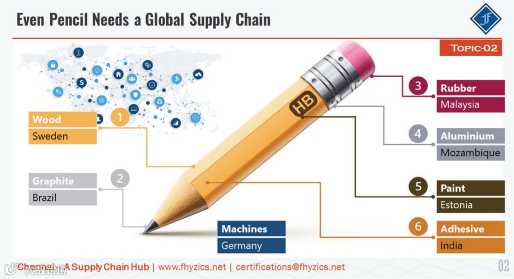 即使是不起眼的铅笔也有极其复杂的供应链。《我,铅笔》这个故事被许多著名经济学家如Leonard Reed、Milton Friedman和Milton Friedman所推广,书名是对他们的致敬。简而言之,他们解释了制造一支铅笔需要世界上多少个不同的地方。与半导体相比,铅笔的供应链相形见绌。