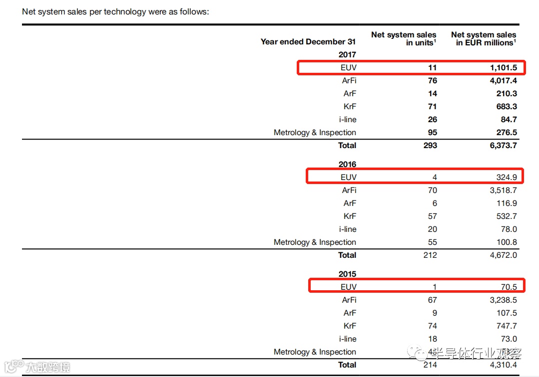 从ASML在2017年发布的年报中可以看出,从2017年开始,其EUV系统的销售数量就出现了飞跃,其在当年所推出的NXE:3400B则是最大的动力——根据其年报显示,2017年,ASML向客户出售10台NXE:3400B EUV系统。