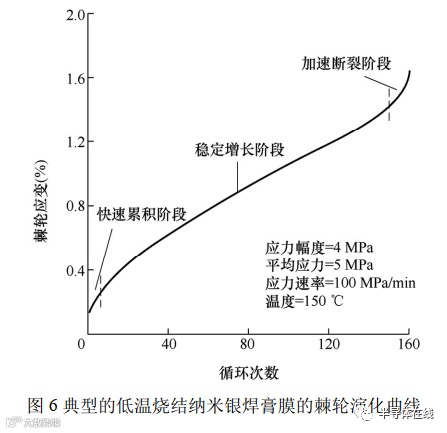 阈值后, 电子风引起互连材料内部的原子定向迁移,从而导致局部电流进一步集中,从而形成正反馈,并最终导致互连结构的孔洞和断路。另一方面,随着电子制造技术的进步,芯片互连材料越来越广泛地应用于动态服役环境(即应力和应变的分布随着时间而变化的环境)中。而功率耗散和环境温度的周期性变化使得电子封装及其组件在封装工艺或者服役过程中不断经历温度循环的作用。由于芯片、基板 以 及 互 连 材 料 的 热 膨 胀 系 数 (Coefficient of thermal expansion, CTE)不匹配,使得在互连界面处产生交变的剪切热应力,该剪切热应力的平均应力不为零,会导致焊层产生塑性应变的积累,使得互连焊层中的损伤不断累积, 发生翘曲、 气孔、 裂纹,导致最终失效,如图 5 所示,我们称之为低周棘轮疲劳失效。