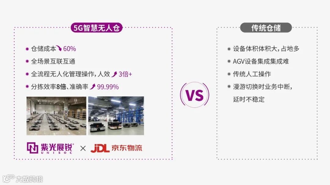 进行5G智能无人仓部署。通过仓储大脑和业务云化部署、边缘计算平台、5G定制专网、5G芯片模组与终端深度融合等手段,实现了商品的入库存储、搬运、分拣等全流程无人化管理和操作。5G终端设备内置基于展锐5G芯片V510的模组,实现了仓储全场景下智能设备与系统的互联互通,提升了规模化机器人的协同工作效率以及智能无人仓的综合竞争力。