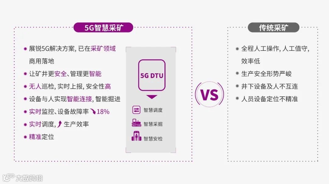 安全生产是采矿行业的第一要务。针对井下生产环境中高瓦斯、高煤尘、水害渗水等特殊问题,工人井下工作时间长、劳动强度大等问题,以及传统采矿业全程人工作业、人工值守、井下设备和人无法互联互通、无法精准定位等技术痛点,5G技术为改善劳动生产环境、监控生产作业安全、提升采矿效益等方面,提供智慧解决方案。