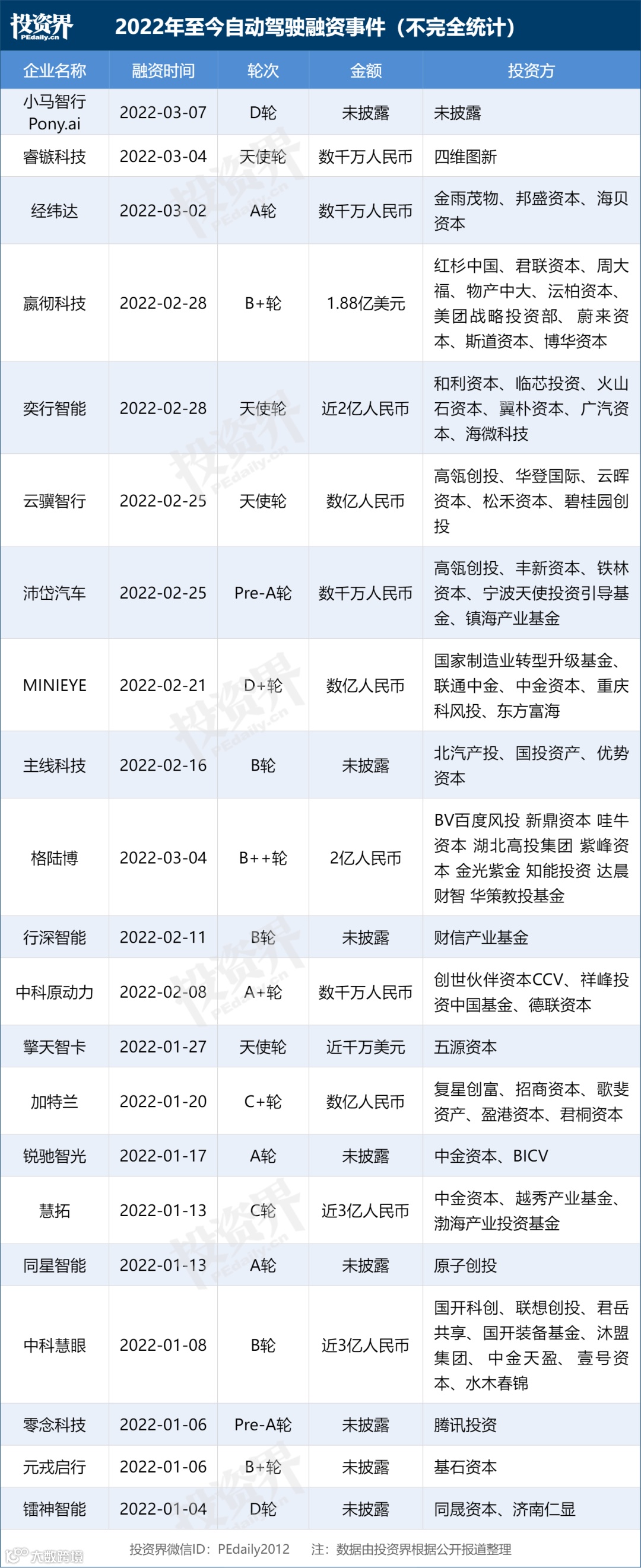 2022年,自动驾驶江湖依旧热闹。据投资界不完全统计,自今年1月至今,自动驾驶行业已发生超过20笔融资事件,其中不乏多笔亿元级别的大额融资,背后更是聚集了一众知名VC/PE。