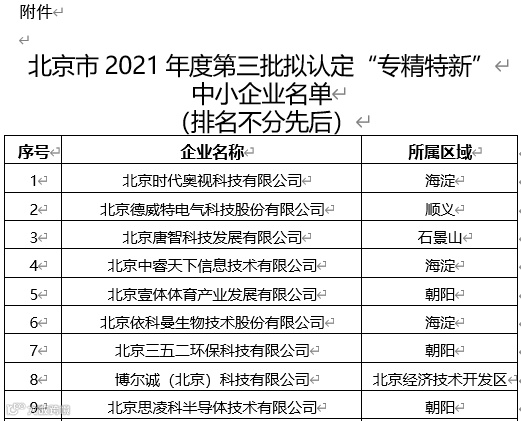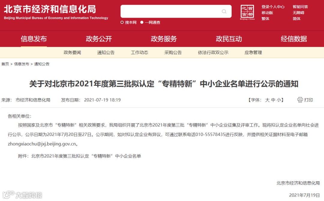市经济和信息化局发布了关于对北京市2021年度第三批拟认定“专精特新”中小企业名单进行公示的通知,公示