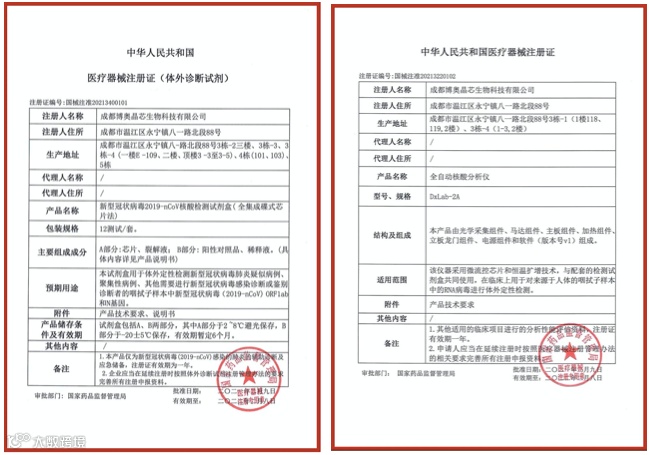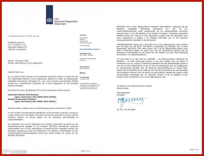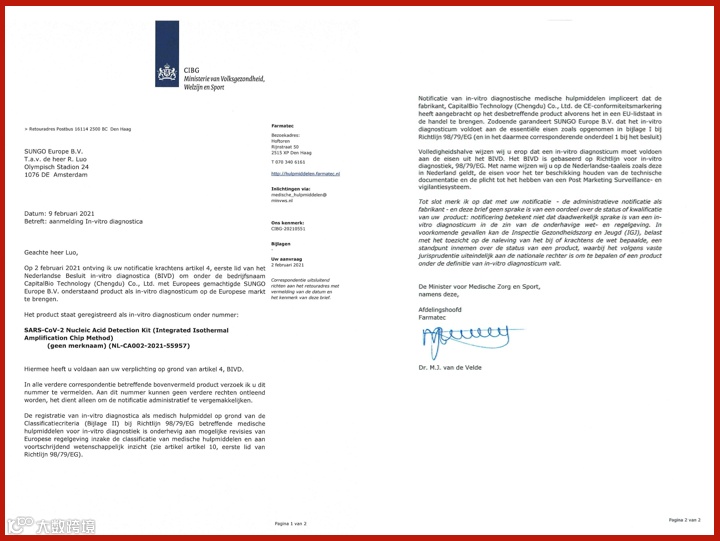 近日,博奥晶典联合清华大学成功研发的由新型冠状病毒2019-nCoV核酸检测试剂盒(全集成碟式芯片法),英文名称:SARS-CoV-2 Nucleic Acid Detection Kit (Integrated Isothermal Amplification Chip Method)和全自动核酸分析仪,英文名称:Automatic Nucleic Acid Analyzer组成的全集成芯片实验室系统获CE准入资质(证书号:NL-CA002-2021-55957和NL-CA002-2021-55450),获CE准入资质表明该产品符合欧盟医疗器械相关指令的符合性要求,具备欧盟市场的准入条件,将为欧洲地区的新冠疫情防控工作提供高灵敏度全集成快速检测工具。