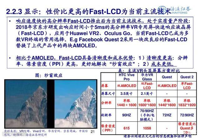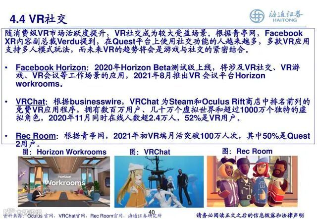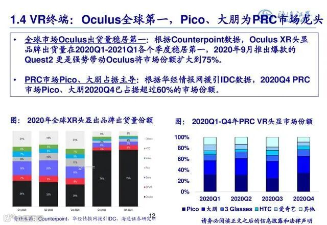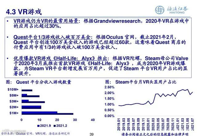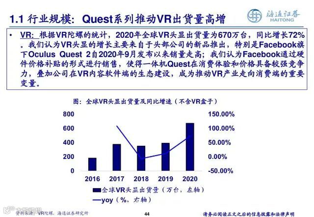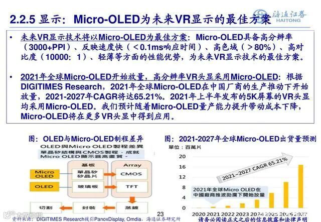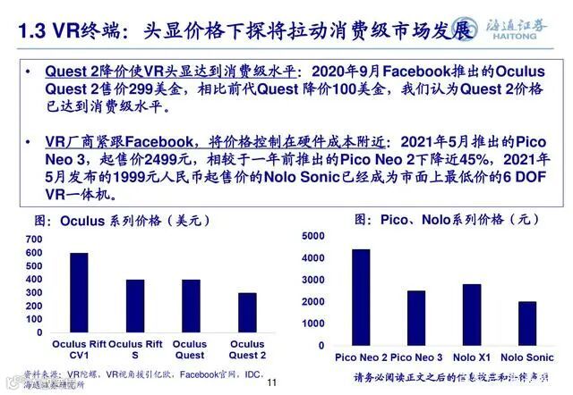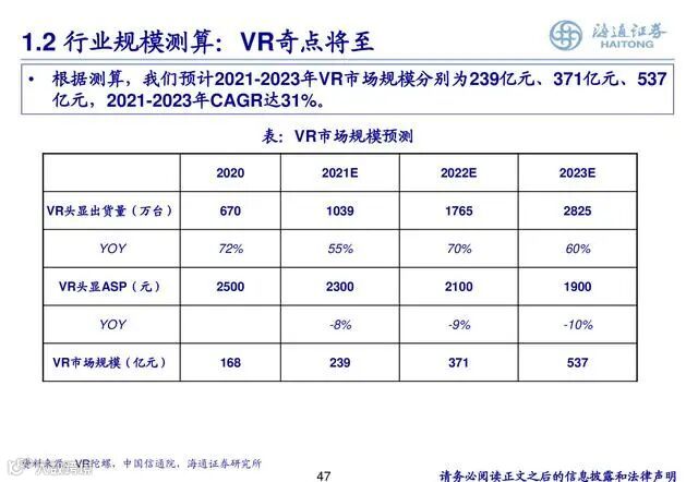 行业出货风险点在于产业链上游缺货的影响:疫情后产业链上游各环节缺货问题在2021年仍难缓解,根据IDC,Facebook 等主要公司面临全球半导体短缺,特别是显示驱动器 IC 短缺,预计供应短缺将直接影响未来2-3个季度的硬件出货节奏。综合以上因素,我们预测2021年VR头显出货量将突破1000万台大关,奇点将至,2021-2023年出货量CAGR达40%。