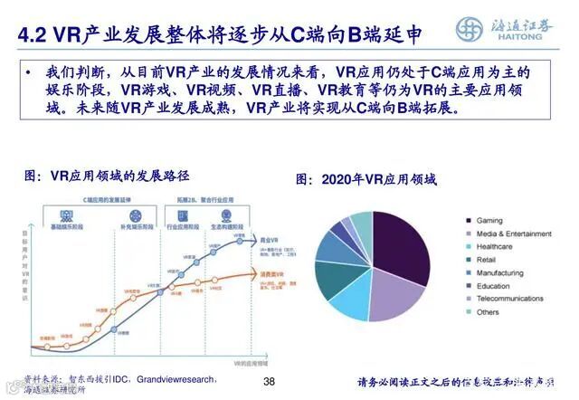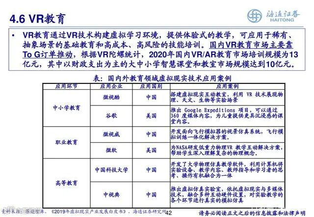 VR教育:VR教育通过VR技术构建虚拟学习环境,提供体验式的教学,可应用于稀有、 抽象场景的基础教育和高成本、高风险的技能培训。国内VR教育市场主要靠 To G订单推动,根据VR陀螺统计,2020年国内VR/AR教育市场培训规模为13 亿元,其中以财政支出为主的大中小学智慧课堂和教室市场规模达到10亿元。