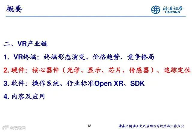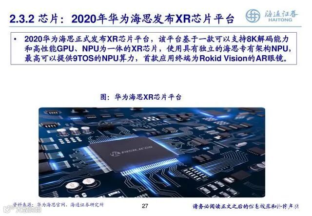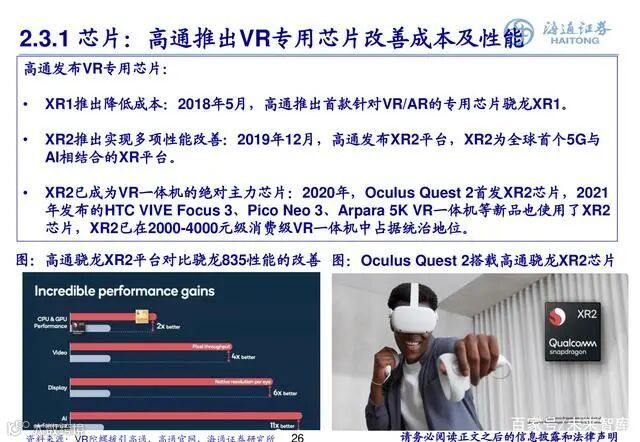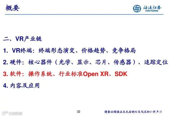 Open XR促进解决软硬件平台分化问题Open XR发布打破软硬件平台分化局面:缺乏跨平台的标准的情况下,VR 和 AR 应用程序和引擎必须使用每个平台的专有 API,导致内容生态发展被碎片 化的软硬件平台分化稀释。2019年7月,Khronos组织发布正式版Open XR1.0规范,Open XR是一个无版权费的、开放式的XR行业标准规范,使应 用程序和引擎(包括 WebXR)能够在任何公开 OpenXR API 的系统上运行。