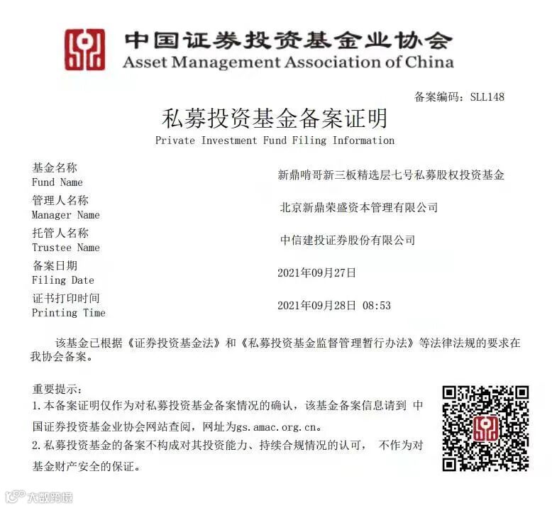 2021年9月28日,新鼎啃哥新三板精选层七号私募股权投资基金(简称“精选层基金”)顺利完成备案。这是北交所开始运行前,新鼎资本进行的最新新三板精选层布局。通过深度挖掘和布局精选层、创新层、基础层的潜在优质企业标的,并且长期持有,获得其成长的高价值性。