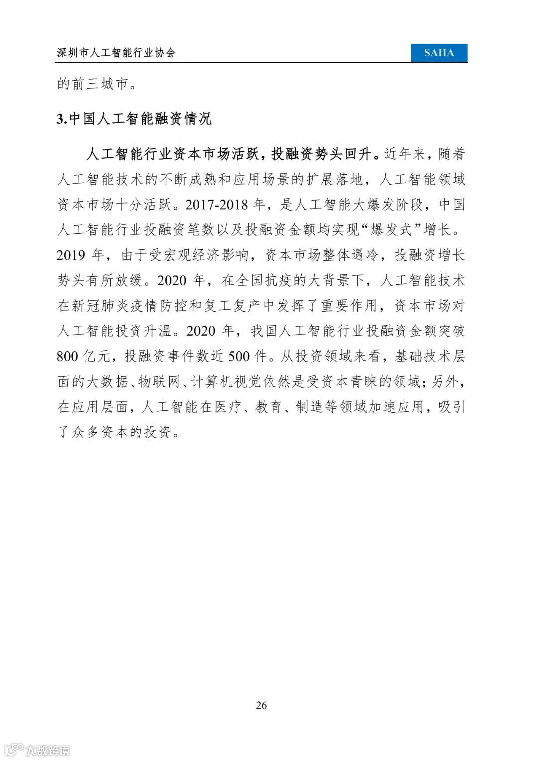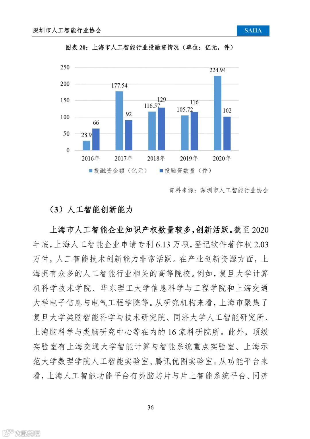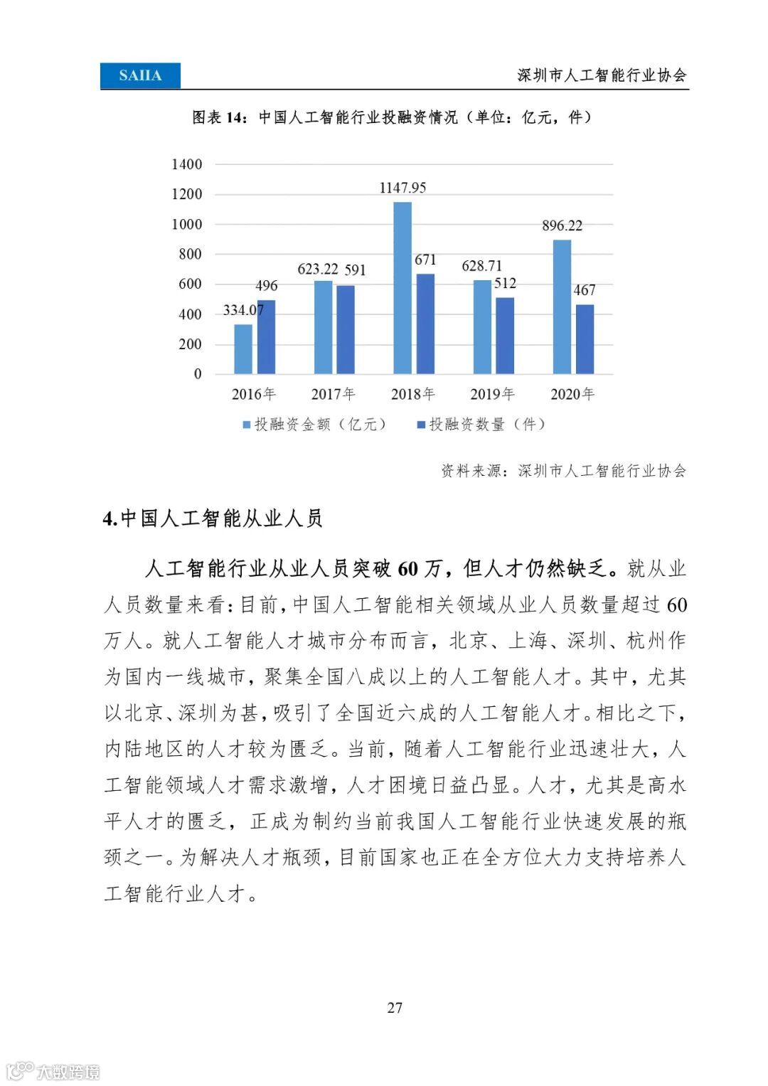 根据白皮书显示,2020年,中国人工智能核心产业规模达到3251亿元,同比增长16.7%;人工智能领域融资金额为896.2亿元,融资数量有467笔,人工智能领域单笔融资额达到1.9亿元,同比增长56.3%。
