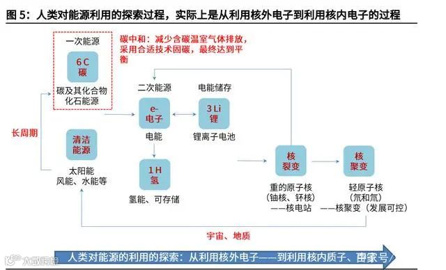 回顾人类对能源利用的探索历程,实际上是从利用核外电子到利用核内电子的过 程,但这恰是宇宙、物质、能源发展的逆过程。二次能源中,对电能的利用是一项伟大的革命,现已成为能源利用的枢纽,从历 史上看,“电”也引发了多次生产技术革命。而氢能同作为二次能源,具有可存储的优势,但也因制备和使用效率稍逊而经济性较差,但从能量循环的角度看, 可以有助于碳的减排。