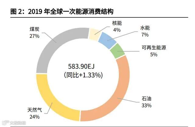 在全球的能源系统中,煤炭、石油、天然气等化石能源仍是能源消费的中坚力量。根据《BP 世界能源统计年鉴》的相关数据,2019 年全球一次能源消费总量为 583.90EJ(艾焦耳,即 10 18 焦耳),同比增长 1.33%;其中煤炭/石油/天然气 占比分别为 27%/33%/24%(总占比 84%);2019 年中国一次能源消费总量达 141.70EJ,其中煤炭/石油/天然气占比分别为 57%/20%/8%(总占比 85%)。无论是全球的能源系统还是中国的能源系统,化石能源在能源消费结构中占比仍 超过 80%,其也是大多数温室气体排放的根源。
