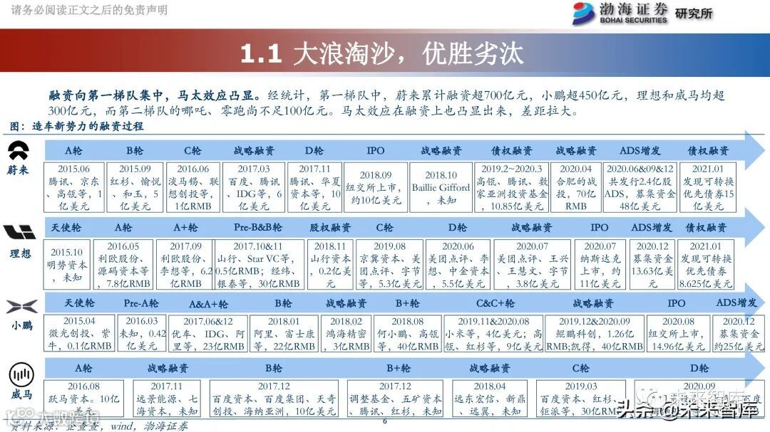 经统计,第一梯队中,蔚来累计融资超700亿元,小鹏超450亿元,理想和威马均超 300亿元,而第二梯队的哪吒、零跑尚不足100亿元。马太效应在融资上也凸显出来,差距拉大。