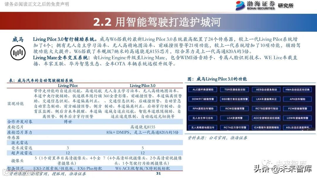 威马W6搭载的最新Living Pilot 3.0系统最高配置了24个传感器,较上一代Living Pilot系统增 加了4个;拥有无人自主学习泊车、无人高精地图泊车、前碰撞预警等21项功能,较上一代系统增加了10项功能,辅助驾 驶功能大大提升。W6搭载了车规级7纳米的高通骁龙8155芯片,综合算力是上一代高通820A的3倍。