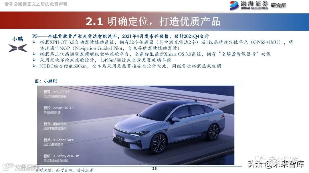 小鹏G3搭载XPILOT 2.5系统,小鹏P7最高搭载XPILOT 3.0系统,小鹏P5最高搭载XPILOT 3.5系统。3.5系统仍采用NVIDIA DRIVE Xavier芯片,算力是Mobileye EyeQ4的12倍;小鹏P5全车搭载32个传感器,较3.0系 统增加1个,较蔚来NIO Pilot、特斯拉Autopilot分别多9、11个,其中有2个车规级激光雷达。在功能上,OTA升级后3.0系 统推出“NGP自动导航辅助驾驶”功能,还新增了车道居中辅助、后向碰撞预警、交通标志识别等功能;3.5系统拥有停 车场记忆泊车、高速自动导航辅助驾驶、城市自动导航辅助驾驶等功能。2021年3月表示,今年将率先量产全球首款搭载激光雷达的智能汽车。