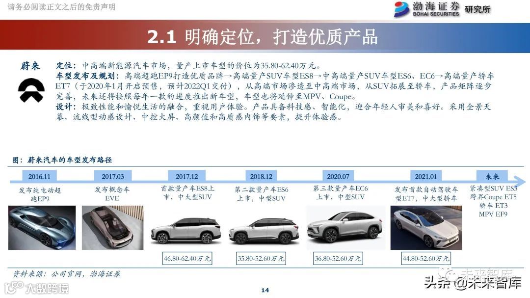 高端超跑EP9打造优质品牌→高端量产SUV车型ES8→中高端量产SUV车型ES6、EC6→高端量产轿车 ET7(于2020年1月开启预售,预计2022Q1交付),从高端市场渗透至中高端市场,从SUV拓展至轿车,产品矩阵逐步 完善,未来还将按照每年一款的进度推出新车型,车型也将延伸至MPV、Coupe。