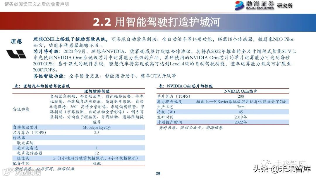 2020年9月,理想和NVIDIA、德赛西威签订战略合作协议,其将在2022年推出的全尺寸增程式智能SUV上 率先使用NVIDIA Orin系统级芯片中运算能力最强的产品,其所使用的NVIDIA Orin芯片的单片运算能力可达到每秒 200TOPS;基于强大的硬件系统,理想汽车将实现最高可达到Level 4级的自动驾驶功能,整车运算能力最高可扩展至 2000TOPS。