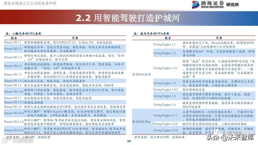 经不完全统计,蔚来、小鹏均已进行了14次OTA升级,理想9次,威马10次,通过OTA完 善辅助驾驶功能、修复缺陷、提高车机智能化水平等。相比较而言,蔚来、理想和小鹏的OTA升级内容更丰富和全面,涵 盖辅助驾驶系统、语音交互、仪表灯,威马的OTA主要集中于智能交互系统,缺乏对辅助驾驶系统的升级。