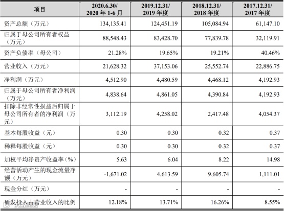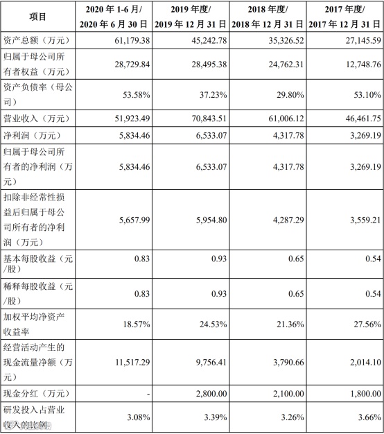招股书显示,2017年至2020年上半年,西安凯立实现营业收入分别为4.65亿元、6.10亿元、7.08亿元、5.19亿元;实现归属于母公司所有者的净利润为3,269.19万元、4,317.78万元、6,533.07万元、5,834.46万元。