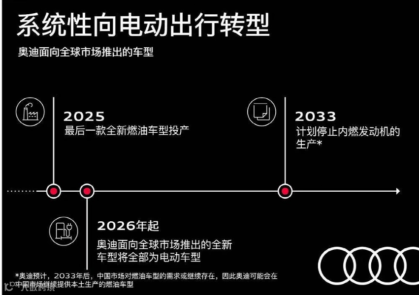 近日,奥迪宣布2026年以后投放市场的新款车将全部为纯电动汽车,汽油和柴油发动机将在2025年之前停止开发,2033年将停止销售燃油车,但上述停售燃油车并不包括中国市场,2033年后将继续本地化生产。