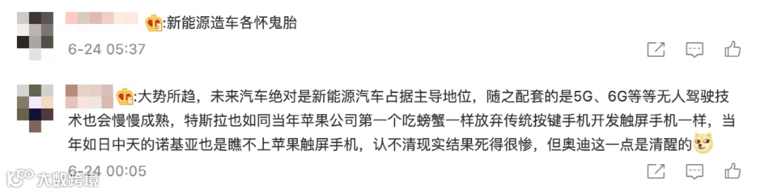 不过也有网友指出,“奥迪区别对待中国市场,这将是其最后悔的决定。”看好新能源车的网友还表示,将对新能源汽车开启定投模式。