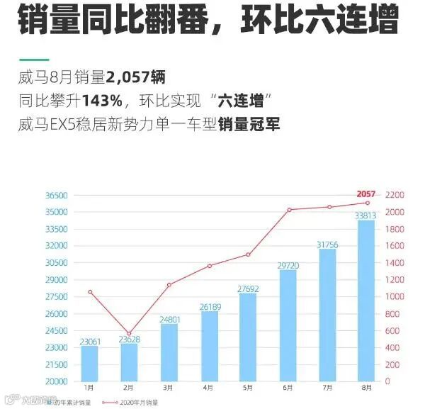 9月3日,威马汽车官方公布了8月份销量数据。威马汽车8月销量达2,057辆,同比增长143%,再次刷