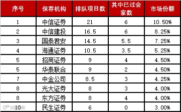 主板中小板IPO排队项目券商排名TOP10