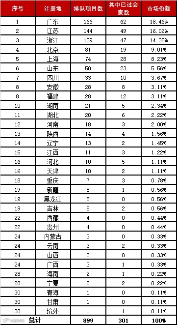 A股IPO排队企业省区排行