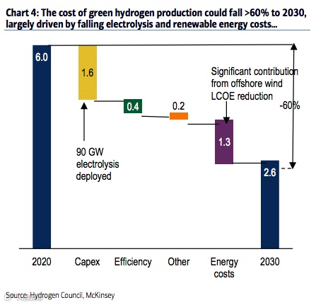 美银美林数据显示,用于生产绿色氢的电解槽和可再生能源成本在过去5年中已下降了50%。