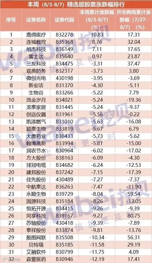 本周5个交易日中,32只精选层股票在8月3日走出普涨行情,随后几日普遍出现回调。累计下来,4股股价上涨,28股下跌。