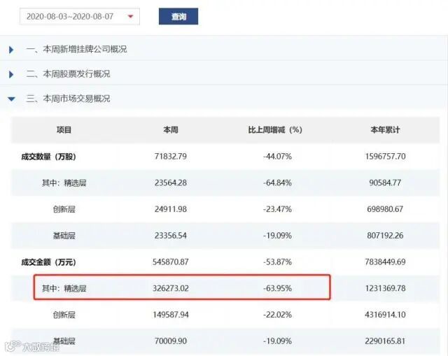本周,精选层股票成交总金额为32.6亿元,占新三板总成交额的60%。与开市首周相比,本周精选层成交总金额下滑64%。