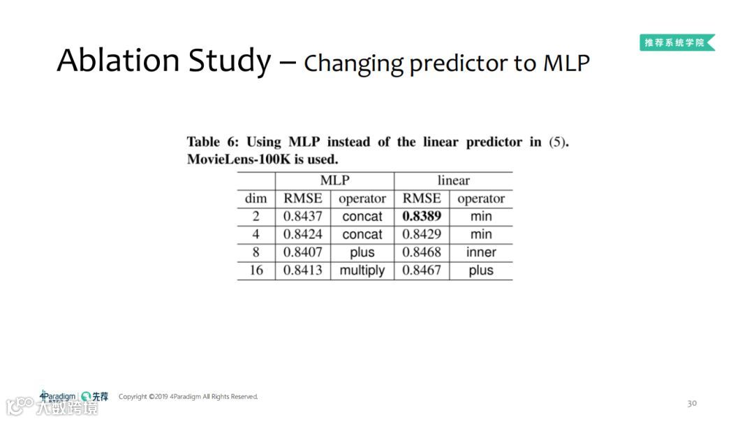 将线性的predictor换成非线性的MLP后,fine-tune的难度会变得更大,复杂度更高,对于在MovieLens-100K数据集上运用MLP替代线性预测器的效果如下,可以看到在该数据集上linear的效果比较好。