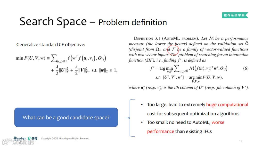 如图左侧是我们的优化目标,写成稍抽象点的形式,F是交互函数,使用了f(ui, vj)替代,w是权重。这个过程,参数在验证集上的验证效果,下一层是训练集上拿到一个嵌入,这是一个比较标准的协同滤波背景下的自动化机器学习。那么怎样设计一个搜索空间呢,如果太大会导致很高很高的搜索计算代价,例如在一百维空间要比一维空间搜索的代价高的多,且随着搜索空间的增大搜索代价成指数级的放大;搜索空间太大不可以,同样的,太小也不可以,太小就不需要自动化机器学习,而且效果要比已存在的交互函数更差。