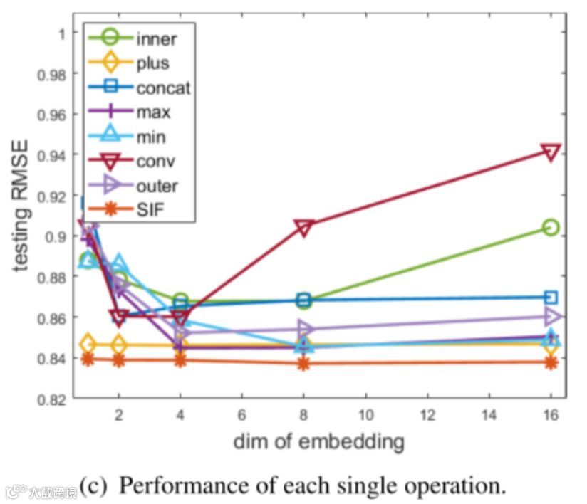 ① 通过不同的embedding维度,对比SIF及其他的CF方法测试集上的RMSE,可以看到SIF、SIF(no-auto)表现出了很好的优势。
