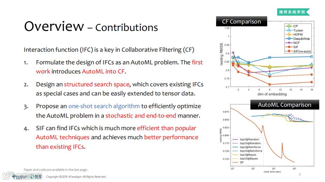 本文介绍了第四范式研究组将自动化机器学习技术引入推荐系统中的一次尝试;特别地,将交互函数的设计建模成一个结构化神经网络问题,并使用神经网络搜索(neural architecture search)技术去设计数据依赖的交互函数。