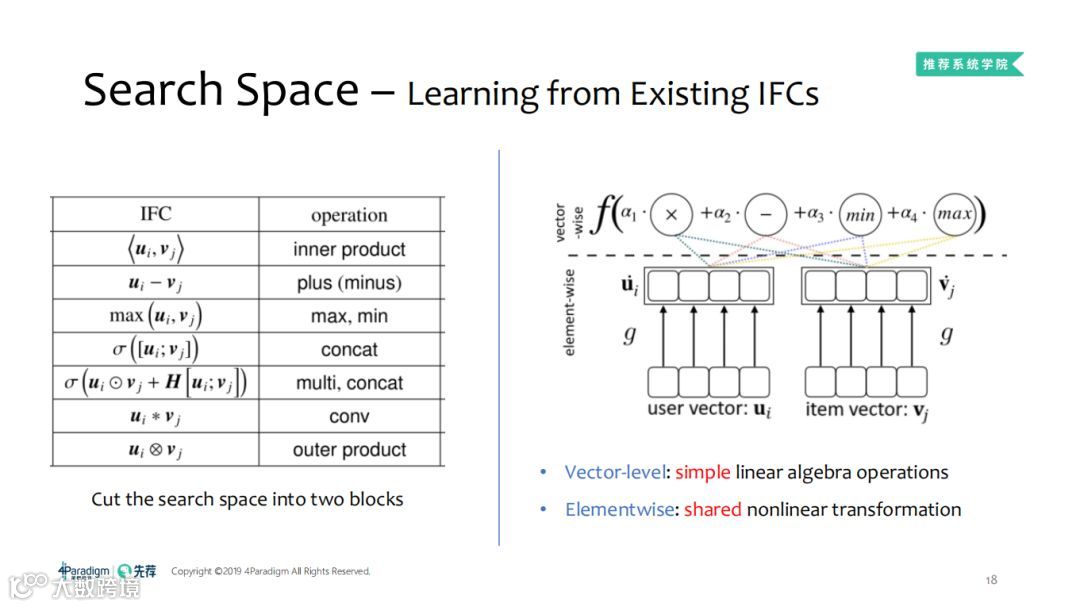 那么怎样设计一个合理的AutoML呢,学习已有算法的长处并弥补他们的短处。左边的就是交互函数,会有加减操作以及简单的向量级别的相关操作,如向量的加减法、串并联、卷积等操作,基于这样的观察,就有了右图,可以看出交互函数有两类元素的操作:vector-level及elementwise: