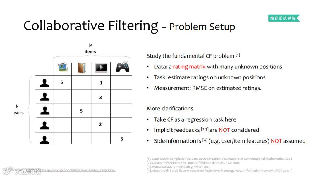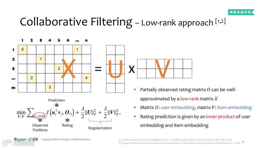让我们回到推荐系统开始爆发的元年,那一年有两个重要的工作广受关注,第一个是推荐系统应用层面的C++,另一个是数据统计分析。那么这两个工作做了什么事呢?有一个全面的观测矩阵,把这个矩阵拆成两个矩阵相乘,U就是一个矩阵,整体优化目标是拟合函数,后面有个正则相,OIC是已经观测到的打分,这是一个CF标准的模板, U可以看成用户的向量,V是物品的向量,在做预测的时候使用UV做了内积与推荐目标进行比较,从2008年开始,推荐系统有单独的会议,09年左右是推荐系统的爆发点。
