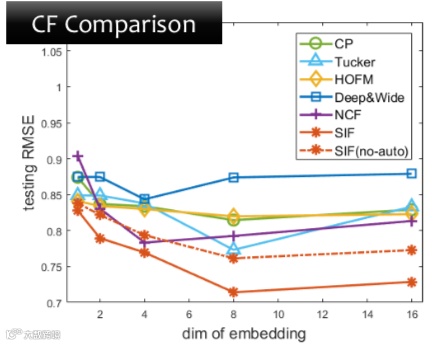 SIF、SIF(no-auto)比常见的协同过滤方法(如CP、Tucker、HOFM、Deep&Wide、NCF等方法)得到更好的效果: