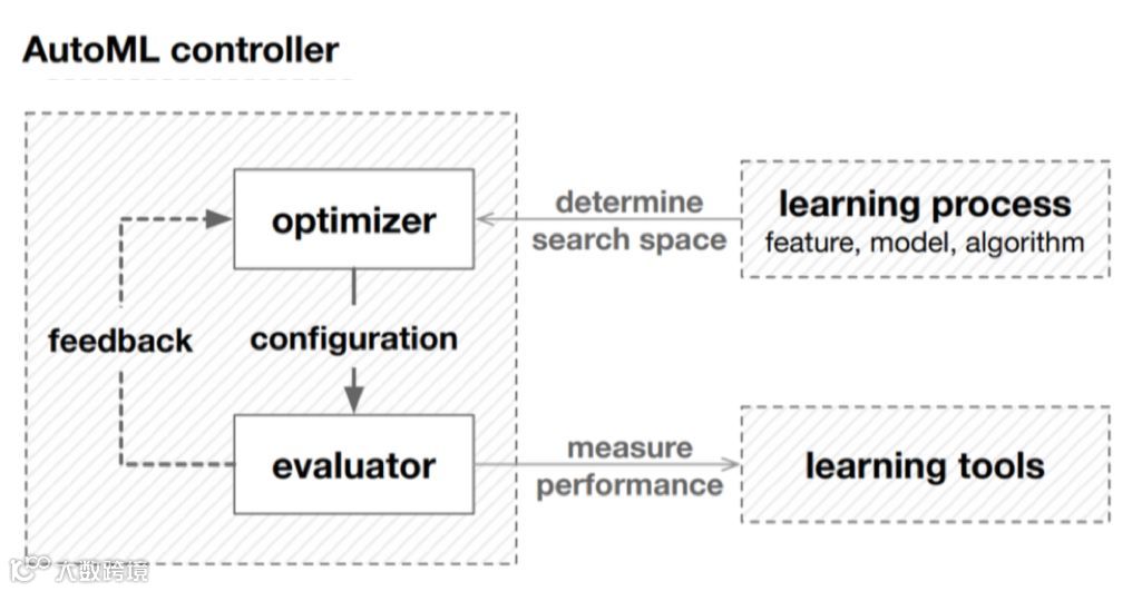 上述三要素在AutoML中对应关系如下:AutoML设计controller,里边包含优化器及评价器。优化器在搜索空间生成更好的候选空间,利用评价器来衡量候选空间的效果,这样反复迭代直至达到结束条件的过程就构成了一个AutoML。