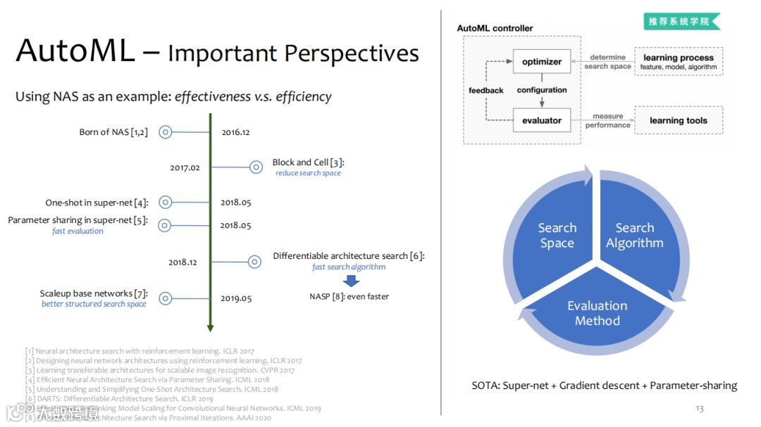 NAS最初是缩小搜索空间,以此缩短搜索时间,提高搜索效率。下一步是改善评价方法,由标准的stand-alone 转变成参数共享。这样就在搜索空间、搜索算法、评价方法这个闭环中完成了NAS三个侧面的一次循环。