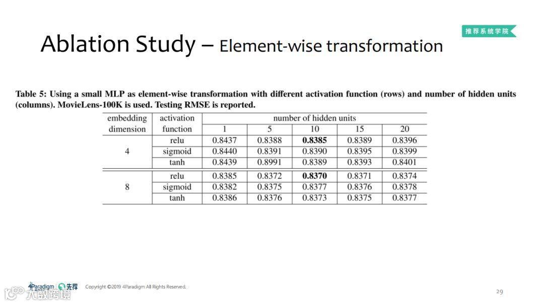 在MovieLens-100K数据集上,对于测试集上的RMSE结果如下表:当隐藏单元数量为10的时候,对于不同的激活函数取得的效果基本相差不大,我们需要的是简单的非线性函数,而不是复杂度特别高的函数。