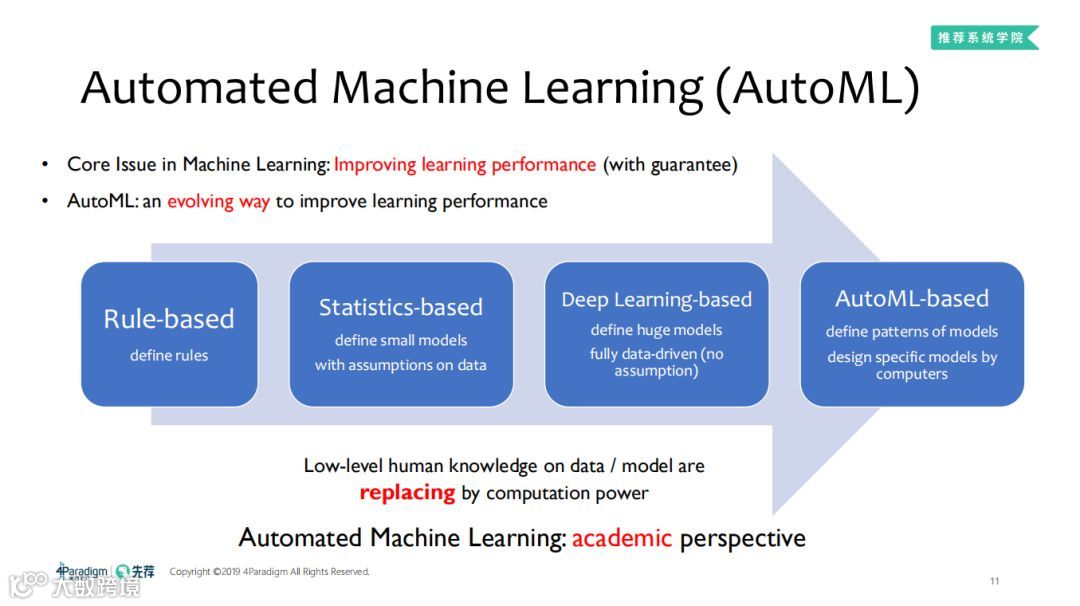 研究交互函数,我们就需要纵观整个自动化机器学习的发展。接下来我们一起从学术角度回顾自动化机器学习,自动化机器学习在机器学习中摆在什么位置呢?