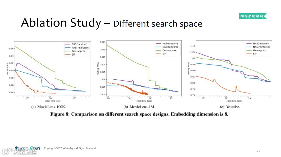 看过整体效果,接下来我们看下细节刻画,首先,搜索空间除了MLP可以放过来,我们也可以在标准的MLP嵌入SIF,图中可以看出,在相对宽泛的数据空间,利用空间还是相对较低的,SIF会明显的快很多。如果增加更多的算法运算,效果会好,MLP越多,100K的数据集上设计了不同的嵌入维度以及激活函数的类型,隐藏层到10左右效果就差不多了,不同的算法区别不大,因为只是拟合一个比较简单的非线性函数,不需要过高的复杂度。