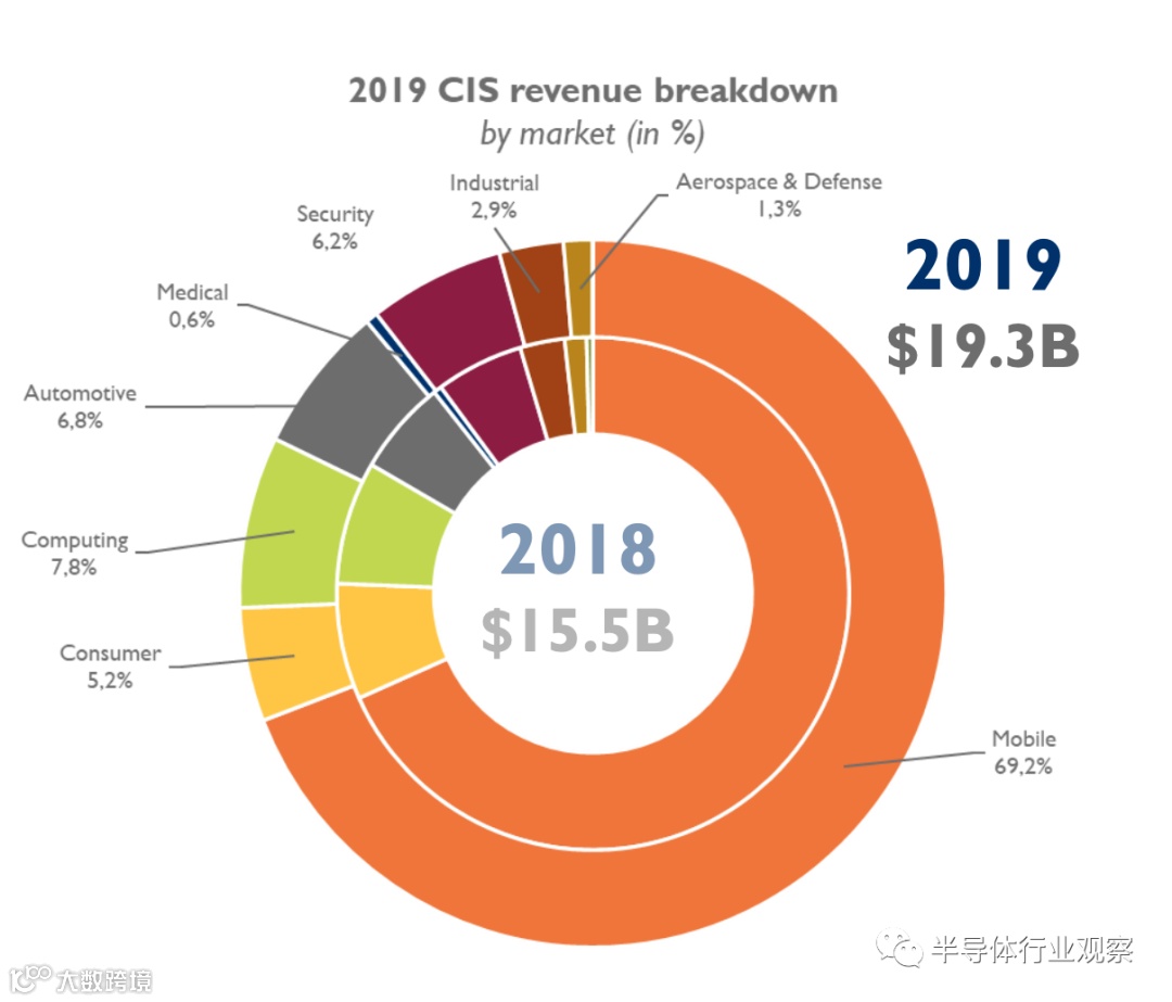 报告指出,截至2019年,该行业营收达到193亿美元,而根据Yole预计,2019年至2025年间,CMOS图像传感器的CAGR预测为8.1%,五年内收入应达到270亿美元。当然,移动会是最大的市场,数据显示移动业务在CIS中占据着最重要的地位,占市场收入的69%,而安全和汽车则在2020年成为CIS第二和第三大细分市场,年复合增长率也高达20%。