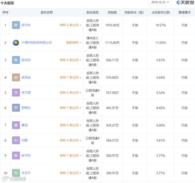 陈守全先生,董事,中国国籍,无境外永久居留权,1948年2月出生,大专学历,中共党员、高级经济师;1967年11月参加工作,1978年11月至1992年4月,就职于郧阳地区拨叉厂,任副厂长、厂长、党委书记;1992年4月至2005年11月就职于湖北省华阳企业集团,任董事长、总经理、党委书记;2005年11月至今就职于十堰华阳投资有限公司,任董事长;陈守全先生曾获全国劳动模范、五一劳动奖章、全国企业管理终身成就奖等荣誉称号。2018年10月经股东大会选举为公司董事,任期三年。