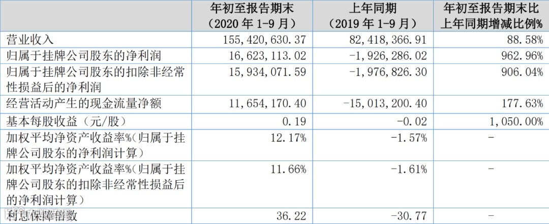 10月15日,亚奥科技发布2020年三季度报告,新三板市场的首份三季报出炉。根据公告,亚奥科技今年前三季度实现营收1.55亿元,同比增长88.58%,归属于挂牌公司股东净利润1662.31万元,同比大增962.96%。