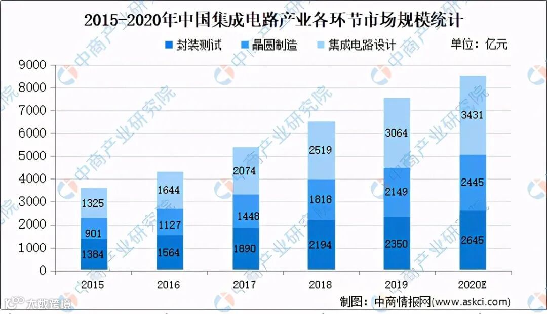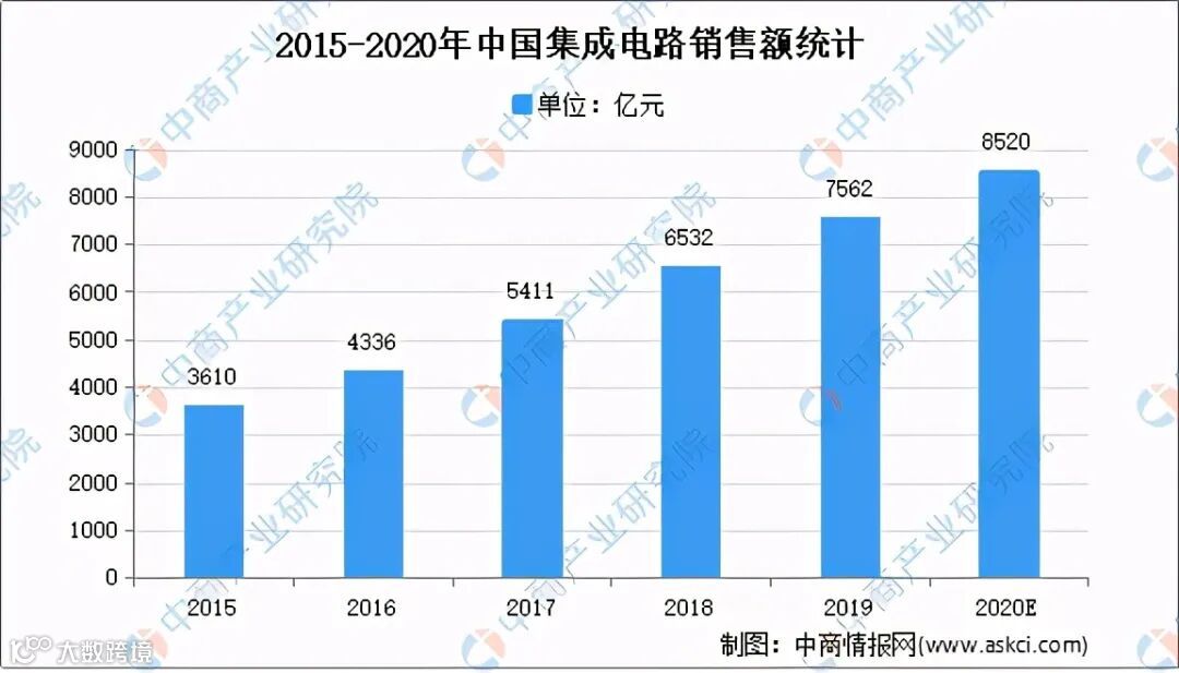 集成电路产业是高技术、高投资、高风险的产业,其发展离不开国家政策长期支持。2020年,在国家政策扶持带动下,我国集成电路行业呈现快速增长的势头,国内集成电路产业规模从2015年的2159亿元上升至2019年的7562亿元,复合增长率达到19.62%。2020年我国集成电路将达8520亿元。