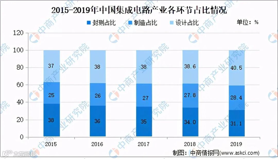 总体来看,芯片设计和封装比重较大,尤其是芯片设计领域近几年来快速增长,在集成电路产业所占比重呈逐年上升趋势,由2015年的33.96%上升至2019年的40.51%。