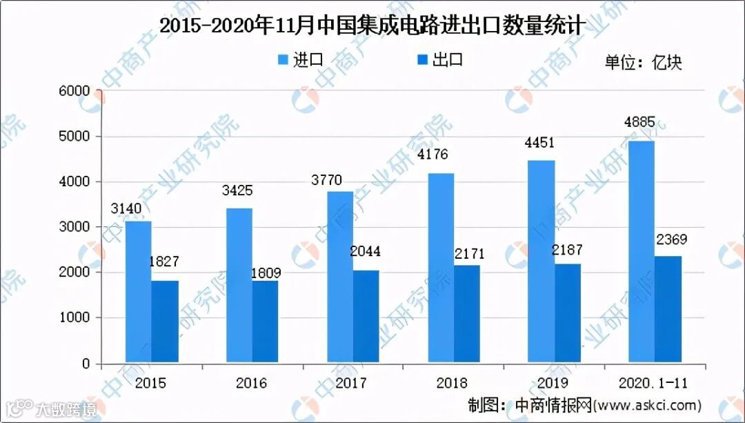 尽管中国的芯片产量在逐渐上升,但我国集成电路市场仍然呈现需求大于供给的局面,国内的集成电路产值远远不能满足国内市场需求,很大一部分仍需依靠进口,特别是高端的芯片仍基本依靠进口,因此进口集成电路仍占主导地位。数据显示,2020年1-11月我国集成电路进口量为4885亿块,同比增长21.9%,进口额为3167.51亿美元;出口量为2369亿块,同比增长20.5%,出口额为1045.59亿美元。