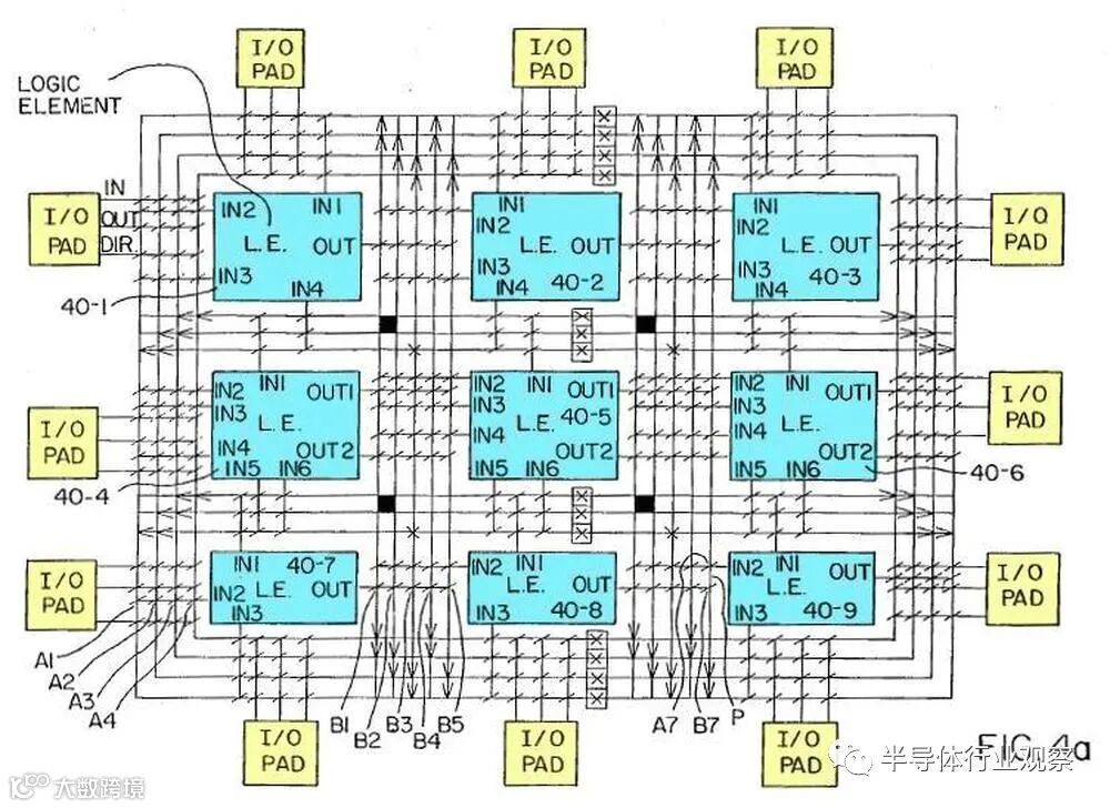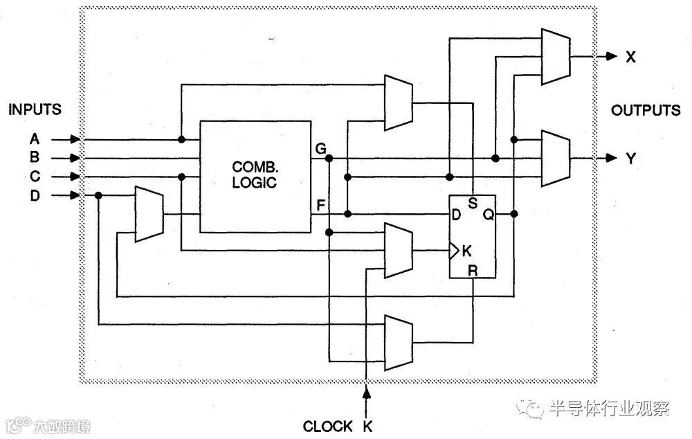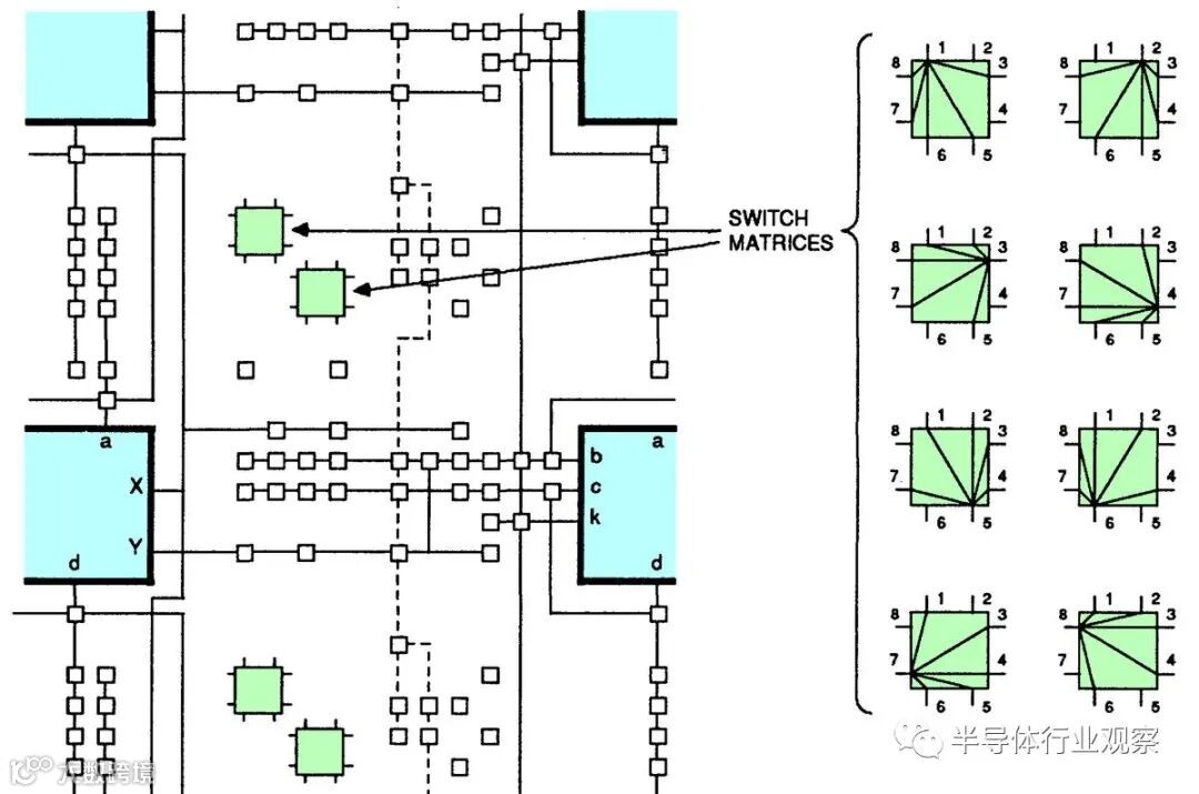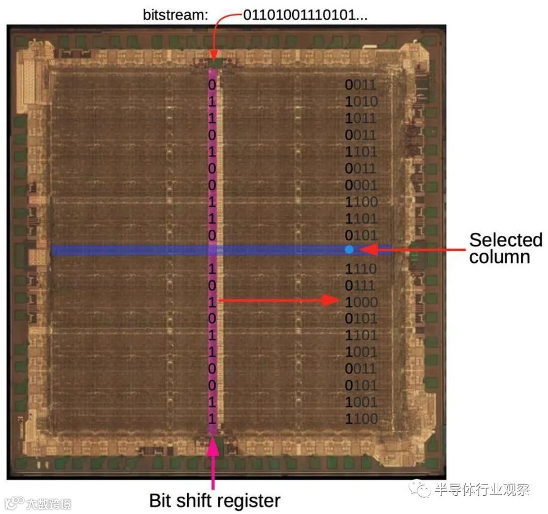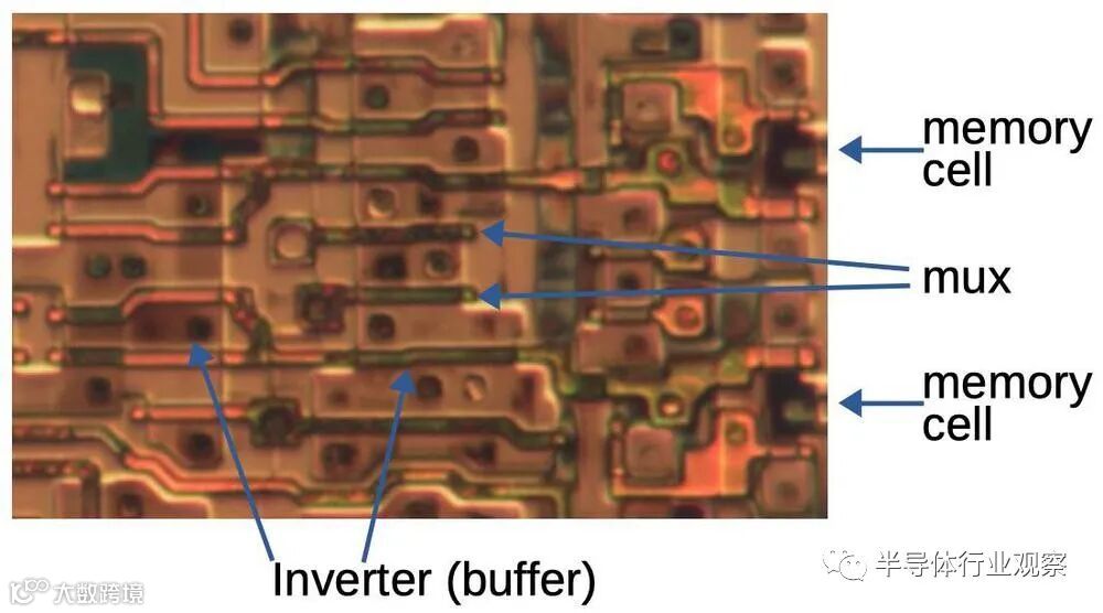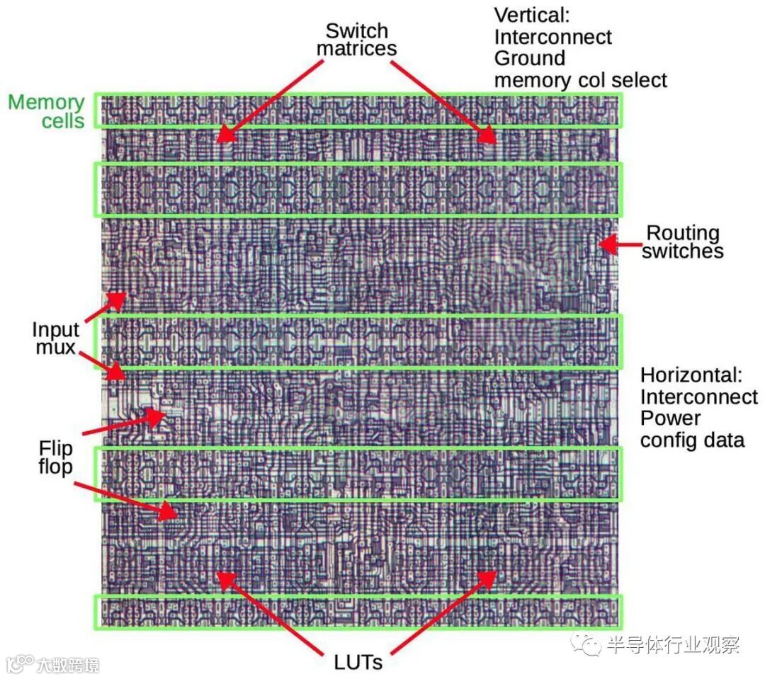 这篇文章的其余部分讨论了XC2064的内部电路,这些照片是根据照片进行反向工程的。 下图显示了XC2064芯片的布局。FPGA的主要部分是8×8的网格。每个图块包含一个逻辑块和相邻的路由电路。尽管FPGA图将逻辑块(CLB)显示为与围绕它们的路由不同的实体,但这并不是FPGA的实现方式。取而代之的是,每个逻辑块和相邻路由都实现为单个实体,即图块。(具体来说,图块包括每个CLB上方和左侧的路由。) I / O模块围绕集成电路的边缘提供与外界的通信。它们连接到小的绿色方形焊盘,该焊盘连接到芯片的外部引脚。die被缓冲区(绿色)划分:两个垂直和两个水平。这些缓冲器可放大在电路中传播很长距离的信号,从而减少延迟。垂直移位寄存器(粉红色)和水平列选择电路(蓝色)用于将位流加载到芯片中,如下所述。
